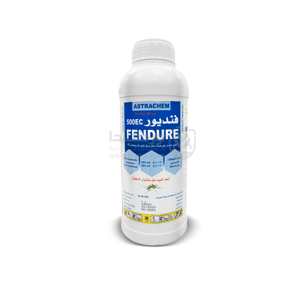 - فنديور 500 إي سي مبيد حشري فوسفوري يحتوي على المادة الفعالة فنثروثيون بنسبة 50% فعال يُستخدم لمكافحة البعوض في البيئات المفتوحة مثل الحدائق والمزارع والمناطق السكنية. يعمل عن طريق التلامس والبلع، ويُطبق باستخدام أجهزة الرش الحراري أو الرذاذ البارد، ما يجعله خيارًا مثاليًا لبرامج المكافحة الاحترافية. يتميز بتركيبته المركزة وسرعة تأثيره في خفض كثافة الحشرات الطائرة.