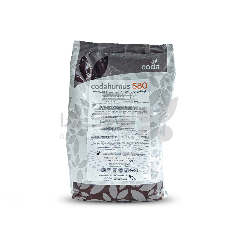 - كوداهوموس إس 80 هو سماد عضوي على هيئة بودرة عالية الذوبان في الماء، يحتوي على 80% من أحماض الهيوميك الطبيعية المستخلصة من مصادر عضوية نقية. يعمل على تحسين خواص التربة الفيزيائية والكيميائية والبيولوجية، ويرفع من قدرتها على الاحتفاظ بالماء والعناصر الغذائية. كما يساهم في زيادة النشاط الميكروبي النافع داخل التربة، ويعزز من كفاءة امتصاص العناصر الكبرى والصغرى، مما يحفّز نمو الجذور ويزيد إنتاجية وجودة المحصول.