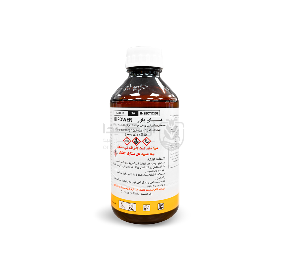 - هاي باور مبيد حشري واسع الطيف يحتوي على المادة الفعالة سايبرمثرين 10% من مجموعة البيروثرويدات، على هيئة سائل مركز قابل للاستحلاب (EC). يعمل بالملامسة والبلع ويستهدف مجموعة كبيرة من الآفات مثل المن، الذباب الأبيض، الديدان، التربس، صانعات الأنفاق والحشرات القشرية. يتميز بسرعة تأثيره وقوة فعاليته على المحاصيل الزراعية المختلفة.