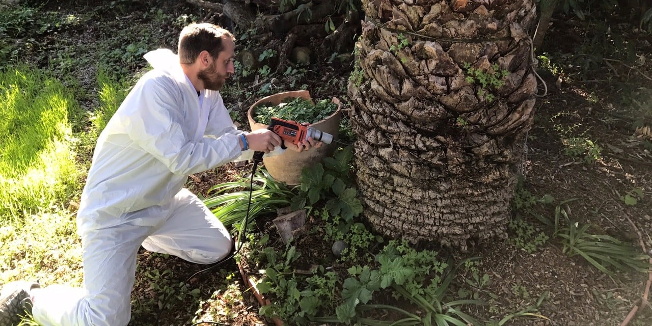 - بعد إزالة السعف الجاف وتنظيف قاعدة النخلة، يجب طلاء الجزء السفلي من الجذع بمبيد وقائي لمنع دخول السوسة أو وضع البيض داخل الشقوق.
