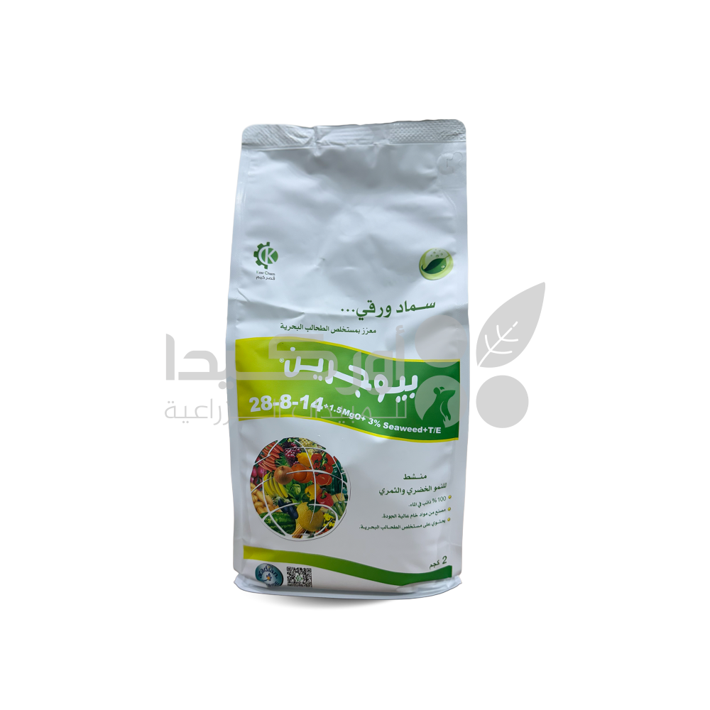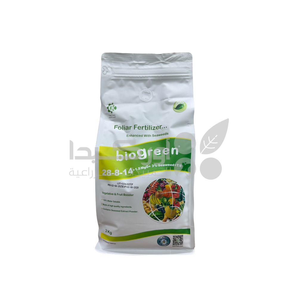 • Biogreen 28‑8‑14 is a foliar fertilizer formulated with a high-nitrogen formula enriched with seaweed extract and micronutrients. It stimulates vegetative growth, increases yield, and improves leaf and fruit quality. It is fully soluble and easy to use for all crops.