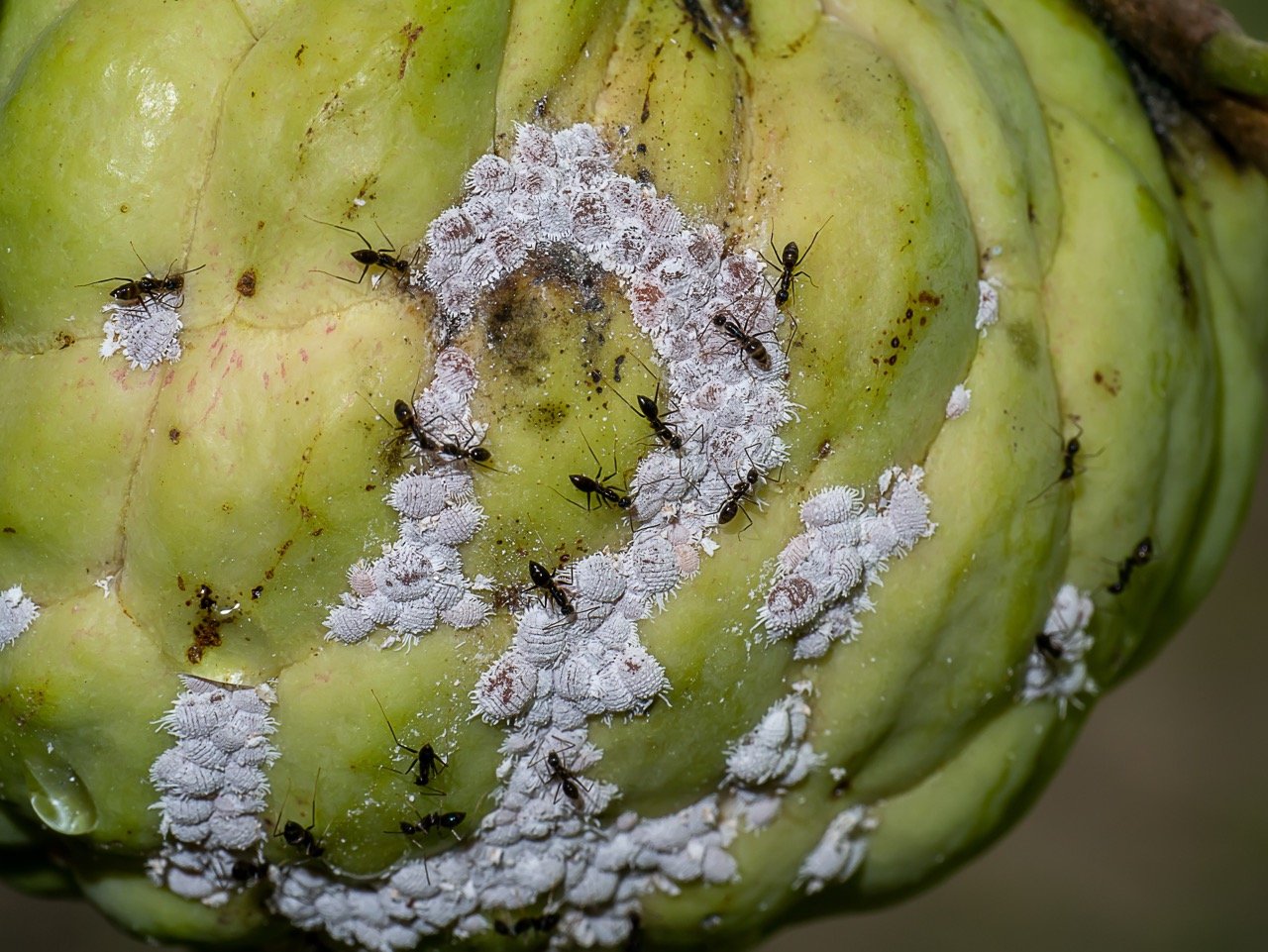 - It feeds by sucking plant sap, leading to general plant weakness. It also secretes a honeydew that encourages the growth of black mold and attracts large numbers of ants, which in turn protect the bug colonies in exchange for feeding on these secretions. Its rapid reproduction and difficulty in reaching it with pesticides make it one of the most difficult pests to control.