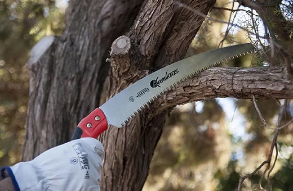 - This professional 53cm (21.8") bow hand saw features a sturdy 33cm (13.8") blade made of SK-4 hardened carbon steel, delivering superior performance for pruning trees and cutting branches up to 8cm (3.25") long . It features a comfortable, non-slip rubberized plastic handle and a durable plastic sheath to protect the blade during transport and storage.