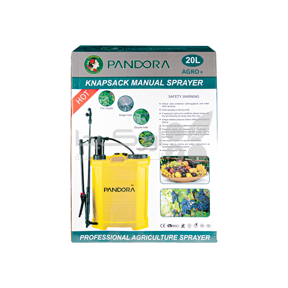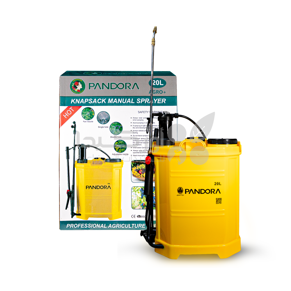 - The Pandora 20-liter hand sprayer is designed for everyday use in fields and gardens. It is used for spraying pesticides and foliar fertilizers, as well as controlling public health pests. It features a durable, easy-to-carry tank and a hand pump that provides constant pressure, facilitating the spraying process and saving the farmer time and effort.