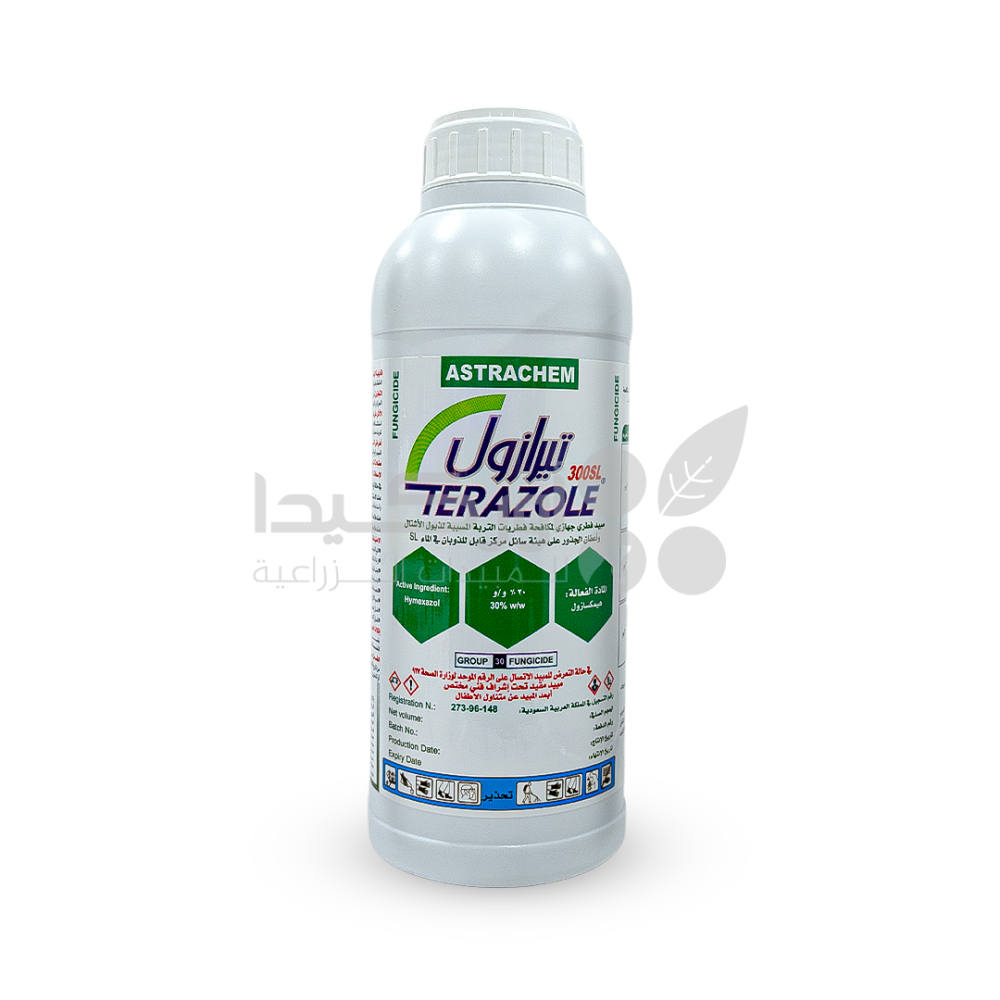 - تيرازول 300 إس إل مبيد فطري جهازي فعّال يحتوي على المادة الفعالة هايمكسازول (Hymexazol) بنسبة 30% على هيئة مركز سائل قابل للذوبان في الماء يعمل على مكافحة الفطريات التي تصيب الجذور والبادرات وتسبب أمراض الذبول والعفن في مراحل الإنبات والنمو الأولى. يمتاز بقدرته على حماية البذور والجذور من الإصابة الفطرية الناتجة عن فطريات التربة مثل فيوزاريوم (Fusarium) وبيثيوم (Pythium)، مما يساعد على إنبات قوي وجذور سليمة ومحاصيل خالية من الأمراض في بدايتها.